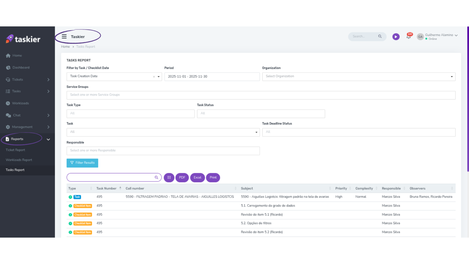 The Task Report provides a detailed and organized view of the tasks and checklist items registered in the system.