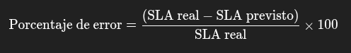 Interpretación: El tiempo real superó el predicho en un 25 %, lo que redujo los retrasos con respecto al SLA.