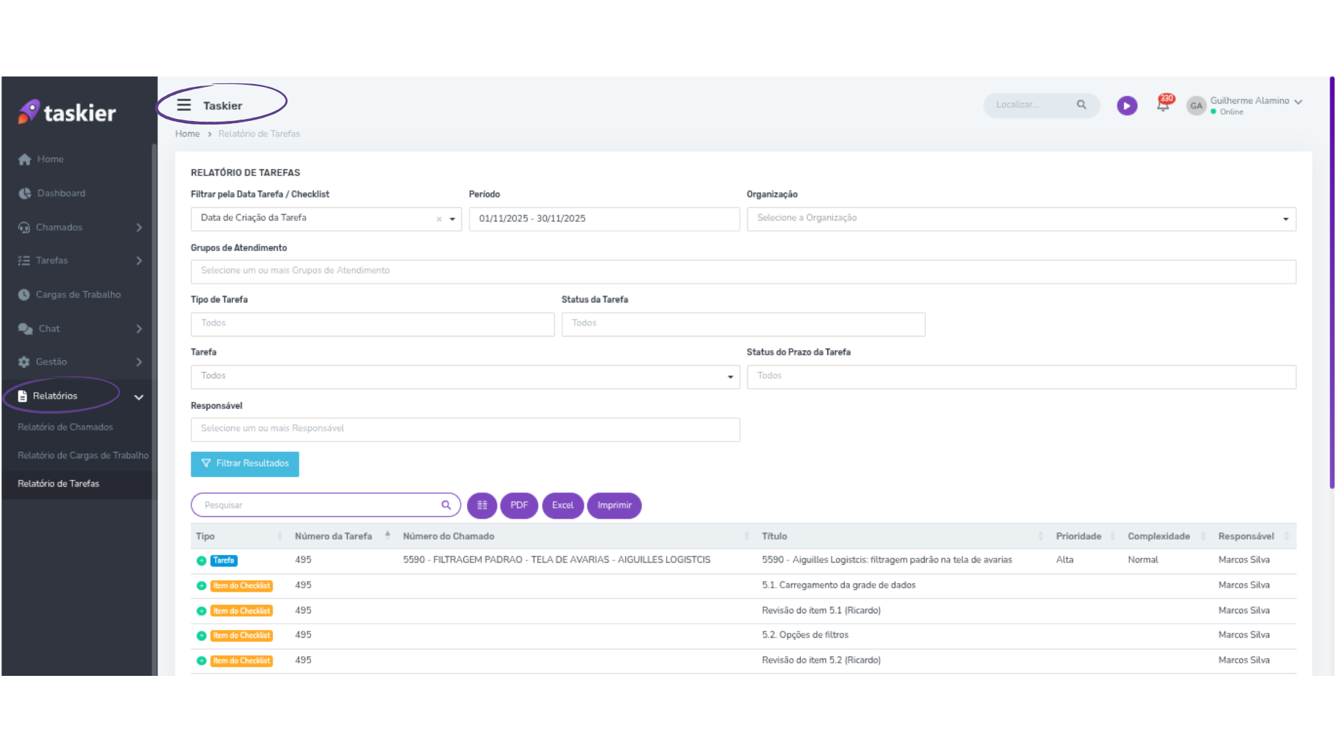 O Relatório de Tarefas fornece uma visão detalhada e organizada das tarefas e itens de checklist registrados no sistema.
